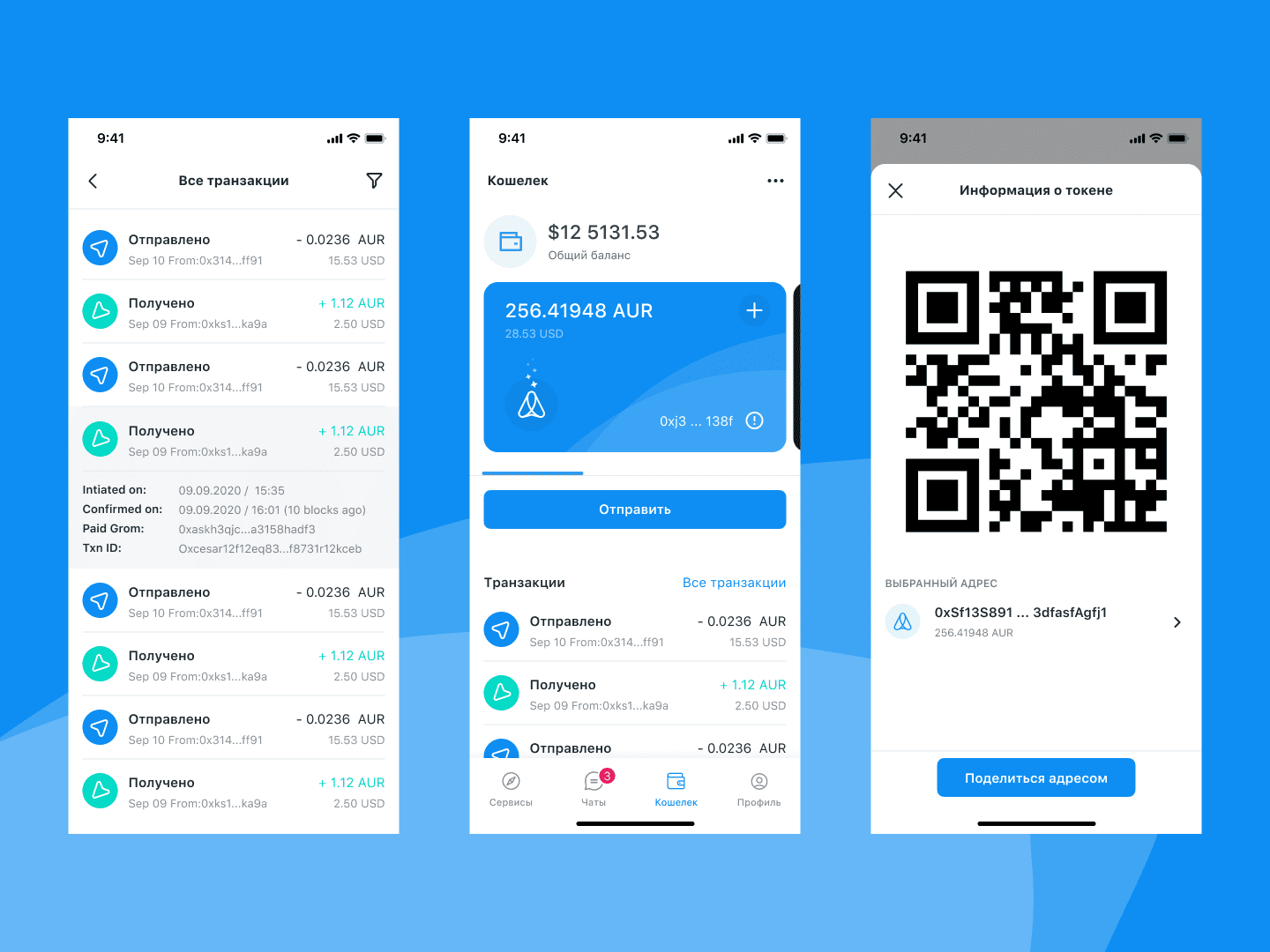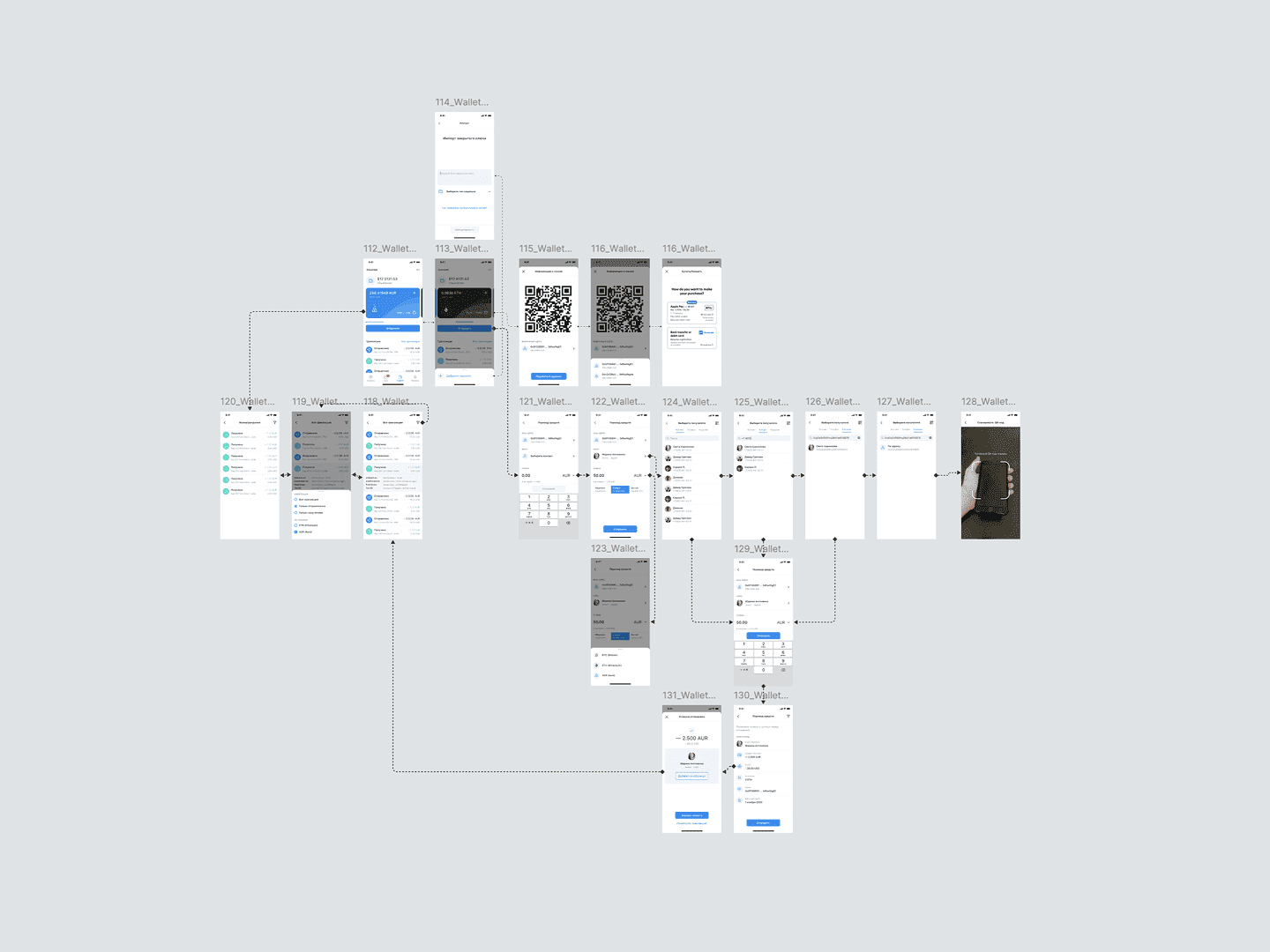 20 wallet screens were designed, featuring token sending and receiving between users, transaction filtering by type and currency, and multi-token balance management.