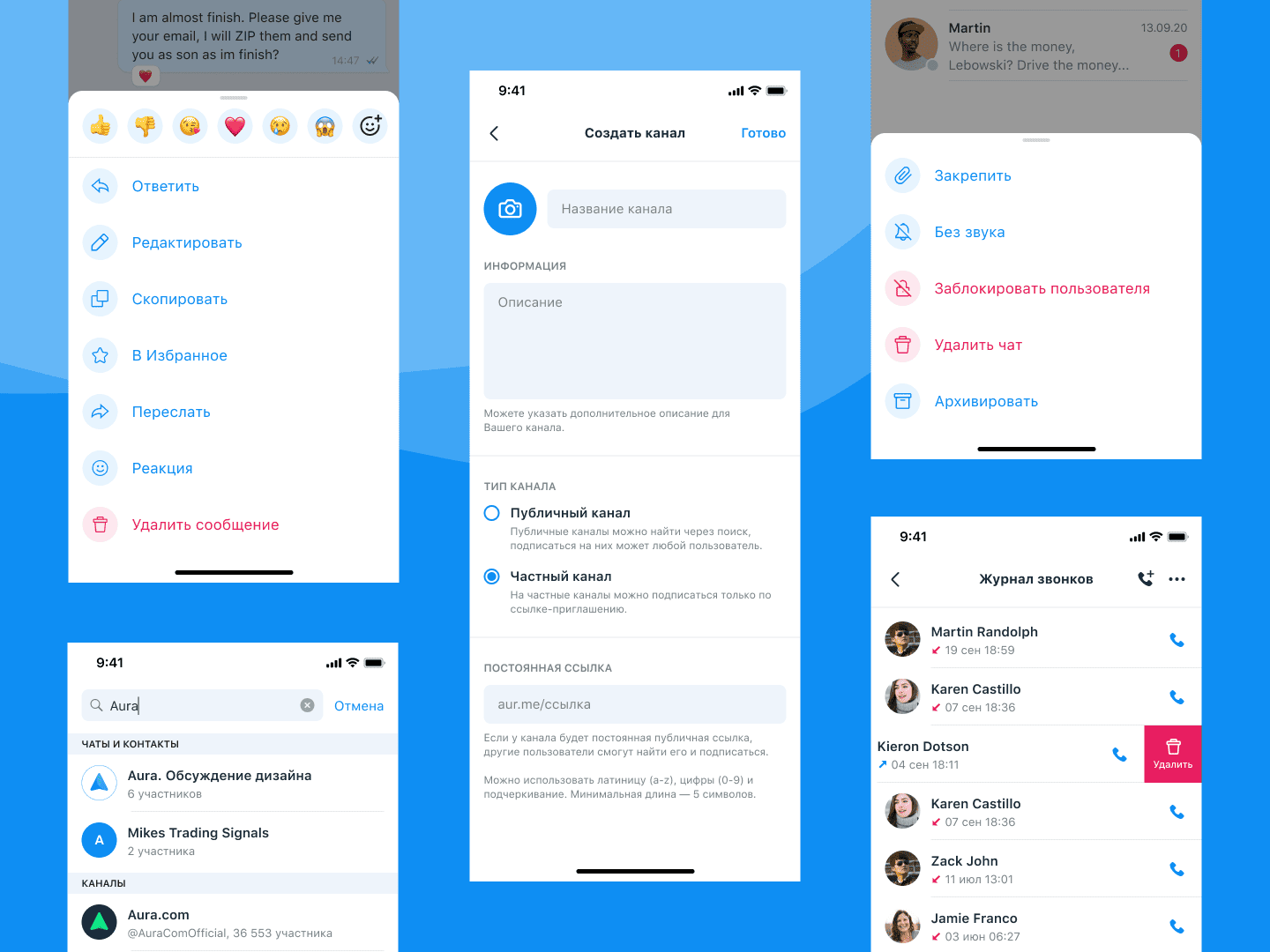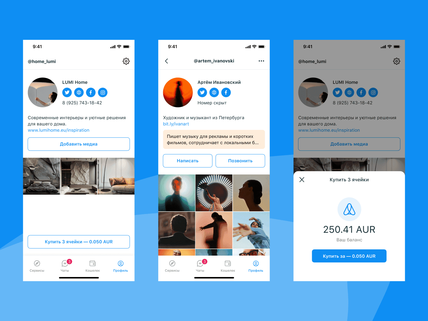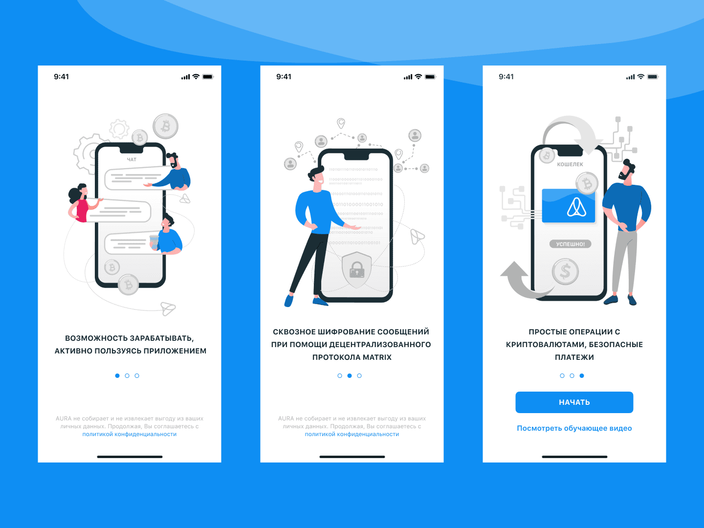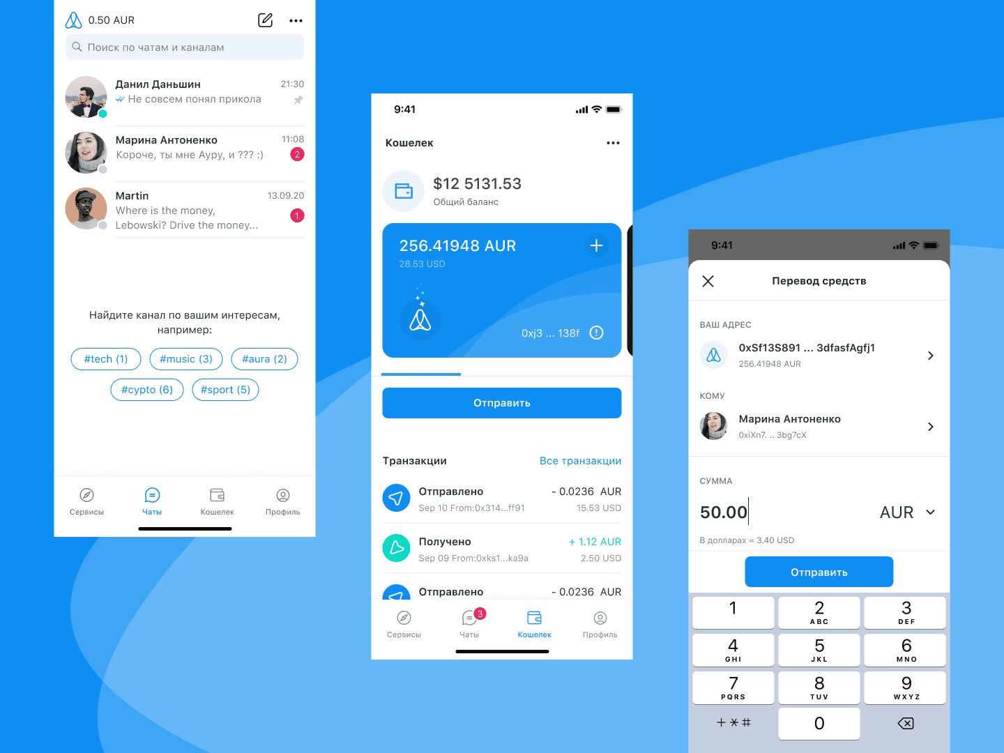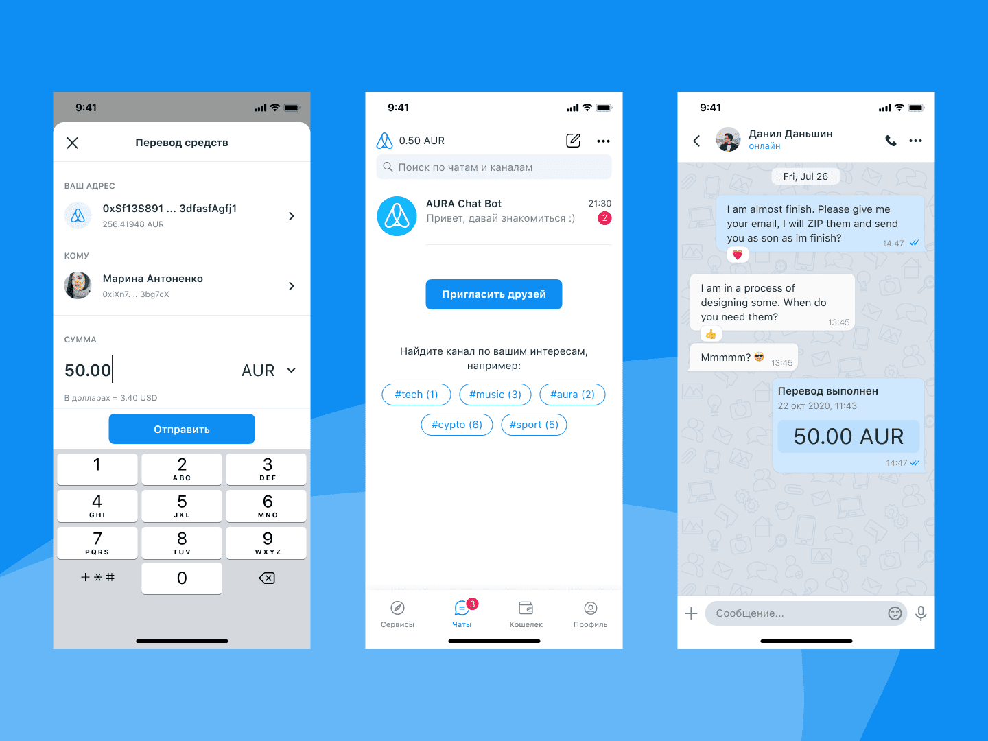 Aura is a mobile app that combines communication, social interaction, and financial tools in one platform. The project had to be built from scratch, starting with a prototype and ending with the initial visual version for Android and iOS.