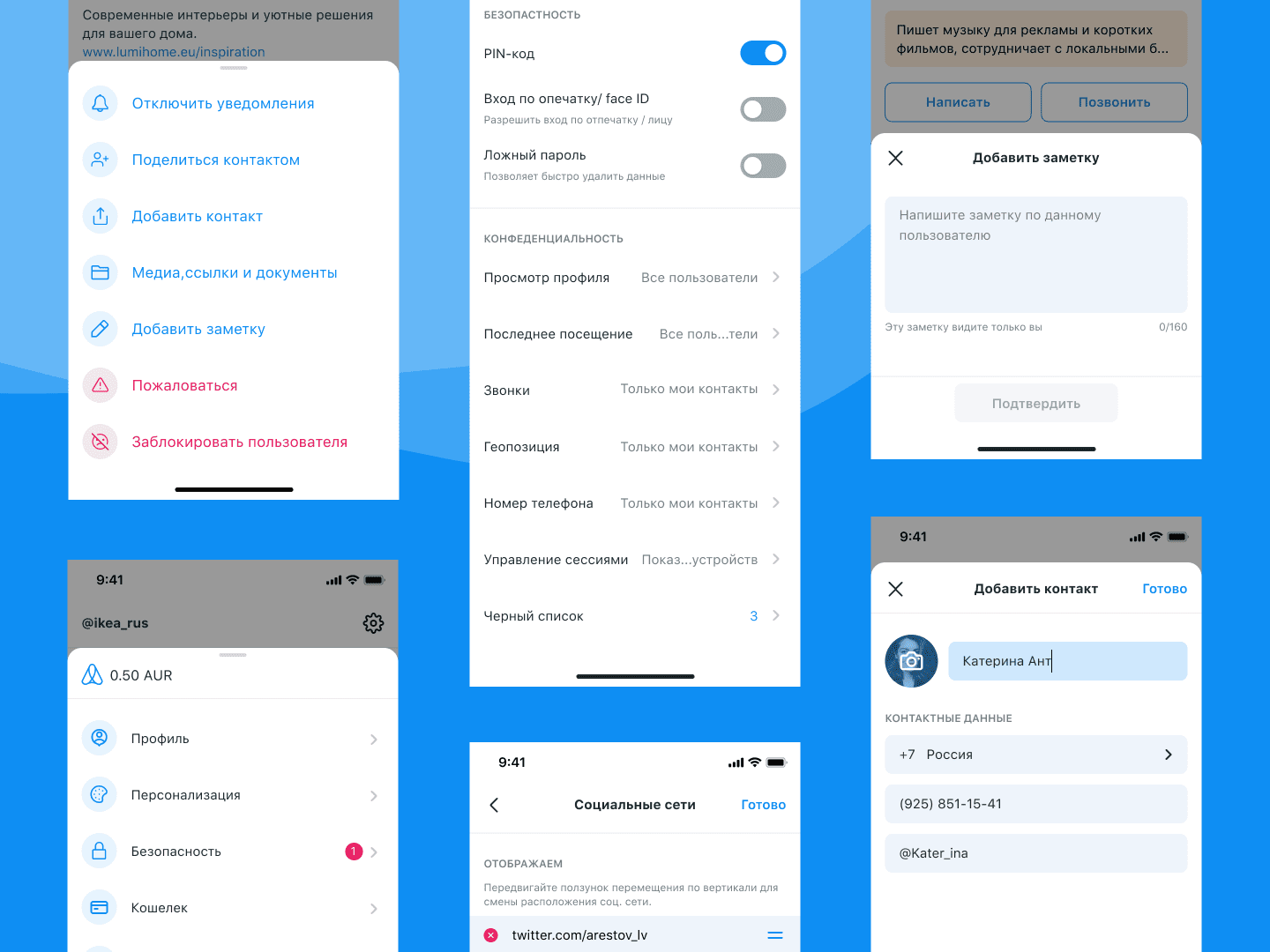 The profile section includes over 60 screens, allowing users to edit their profile, add photos and notes, adjust language, theme, and background, as well as manage basic privacy and security settings.