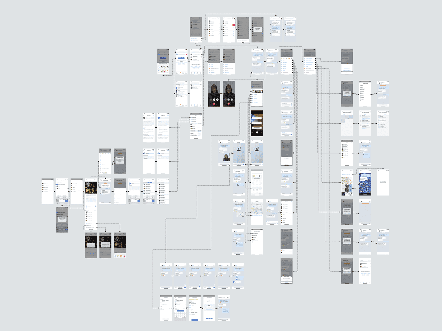 Over 80 screens were developed for the chat section, including dialogue lists, search, notifications, group creation, participant profiles, media sharing, and real-time display of transferred amounts within conversations.