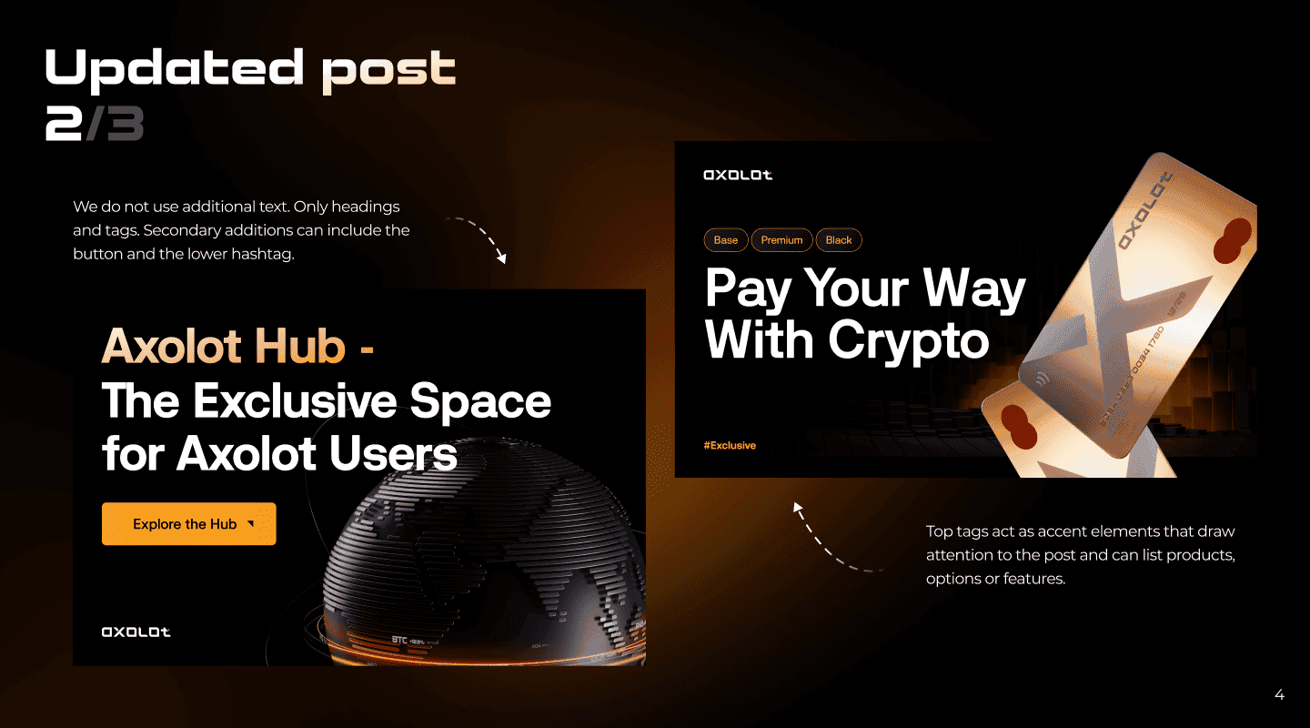 Axolot is a crypto platform that brings together decentralized products such as wallets, crypto cards, and investment tools. The team needed branded visuals for promotion on Twitter and Telegram.