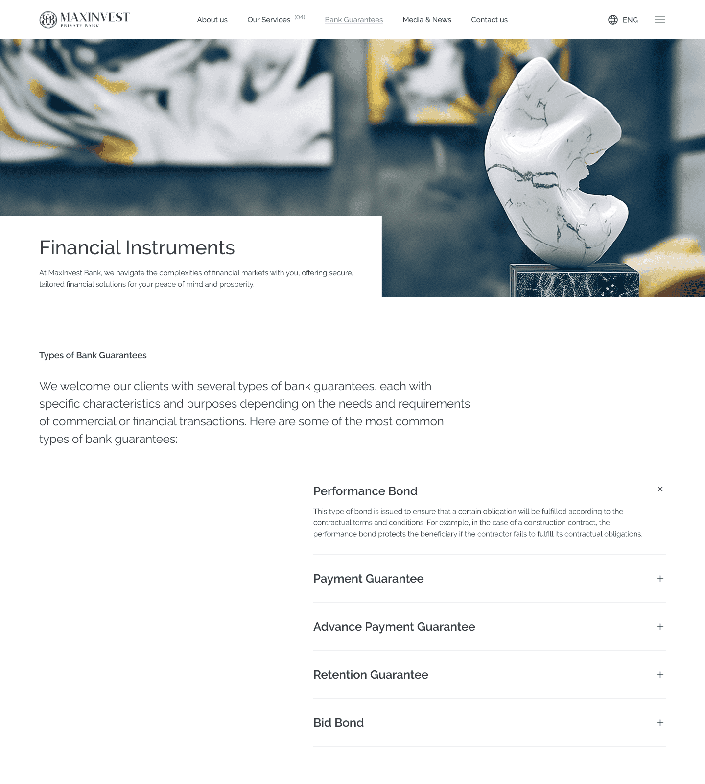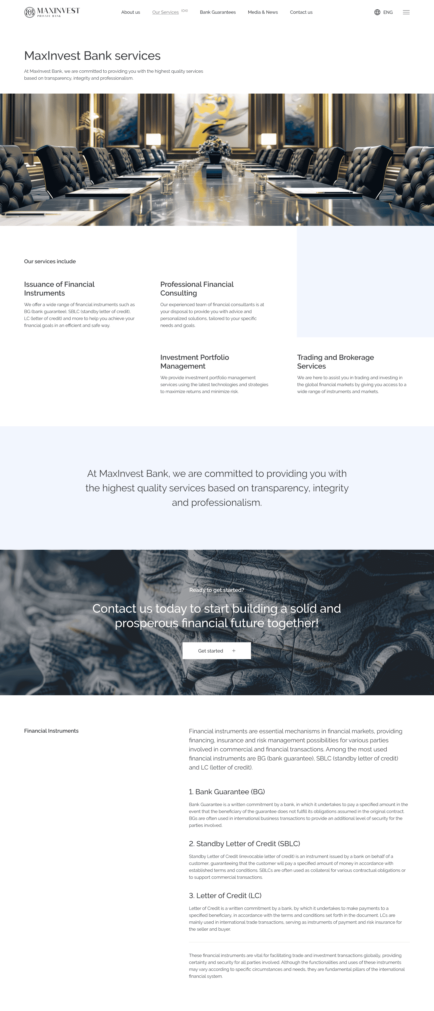 Over 10 pages were designed for this bank. The examples shown include Our Services, Media & News, and Types of Bank Guarantees.