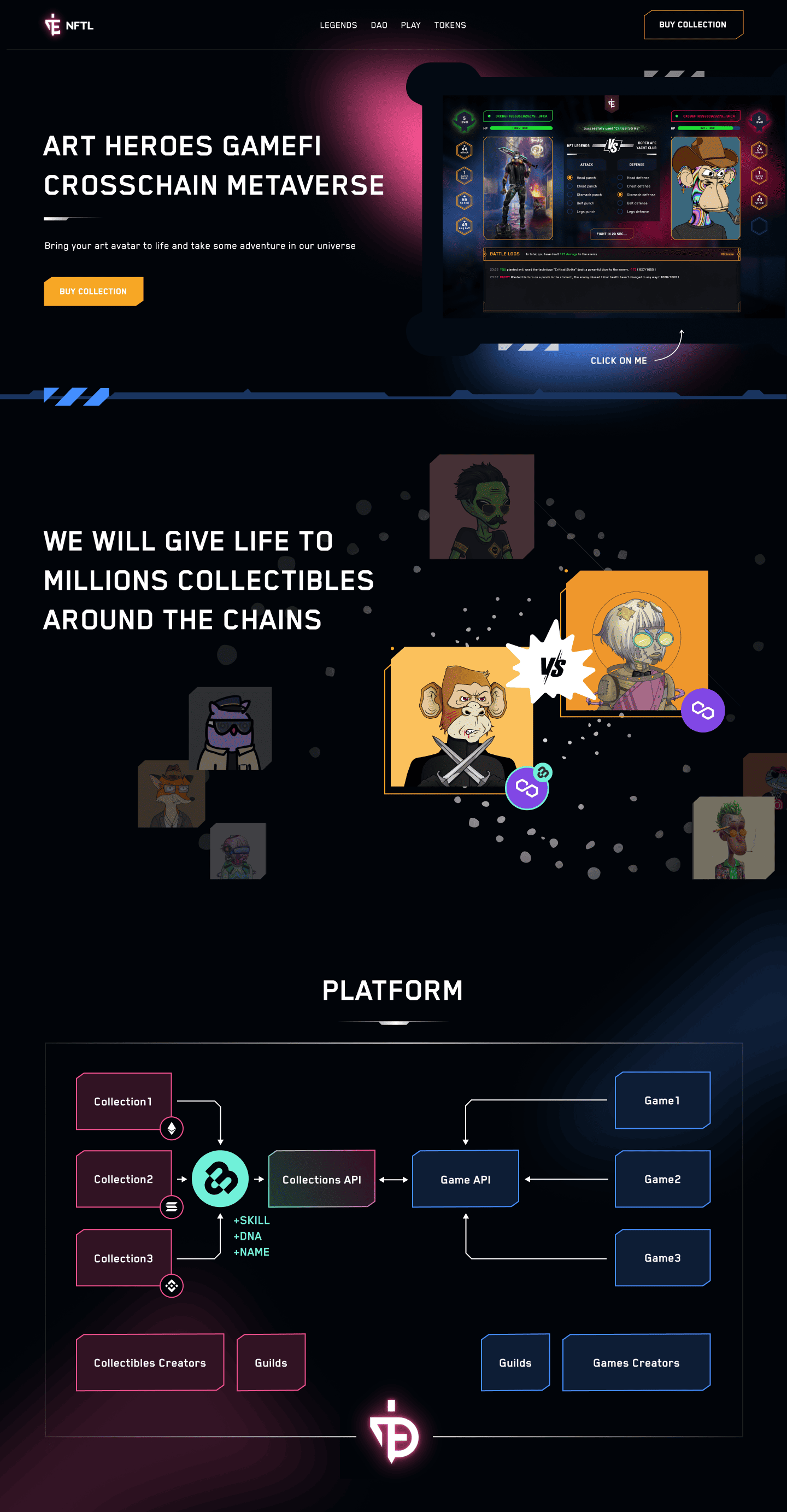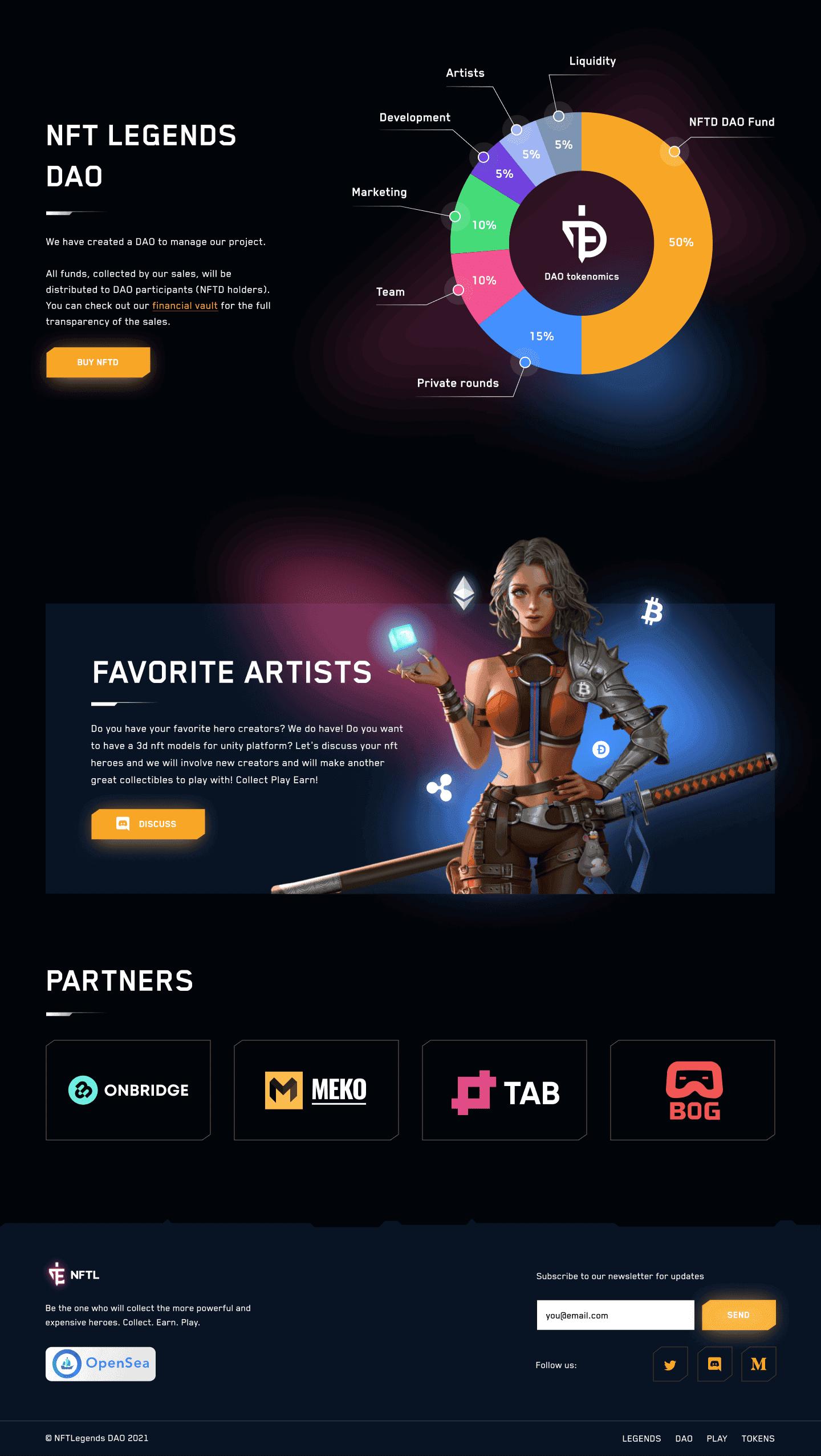 NFT Legends is a collectible game ecosystem built around NFT heroes, governance, and its own token. The task was to design a full web platform that combines the sales experience, user dashboard, and brand identity into one cohesive visual system.