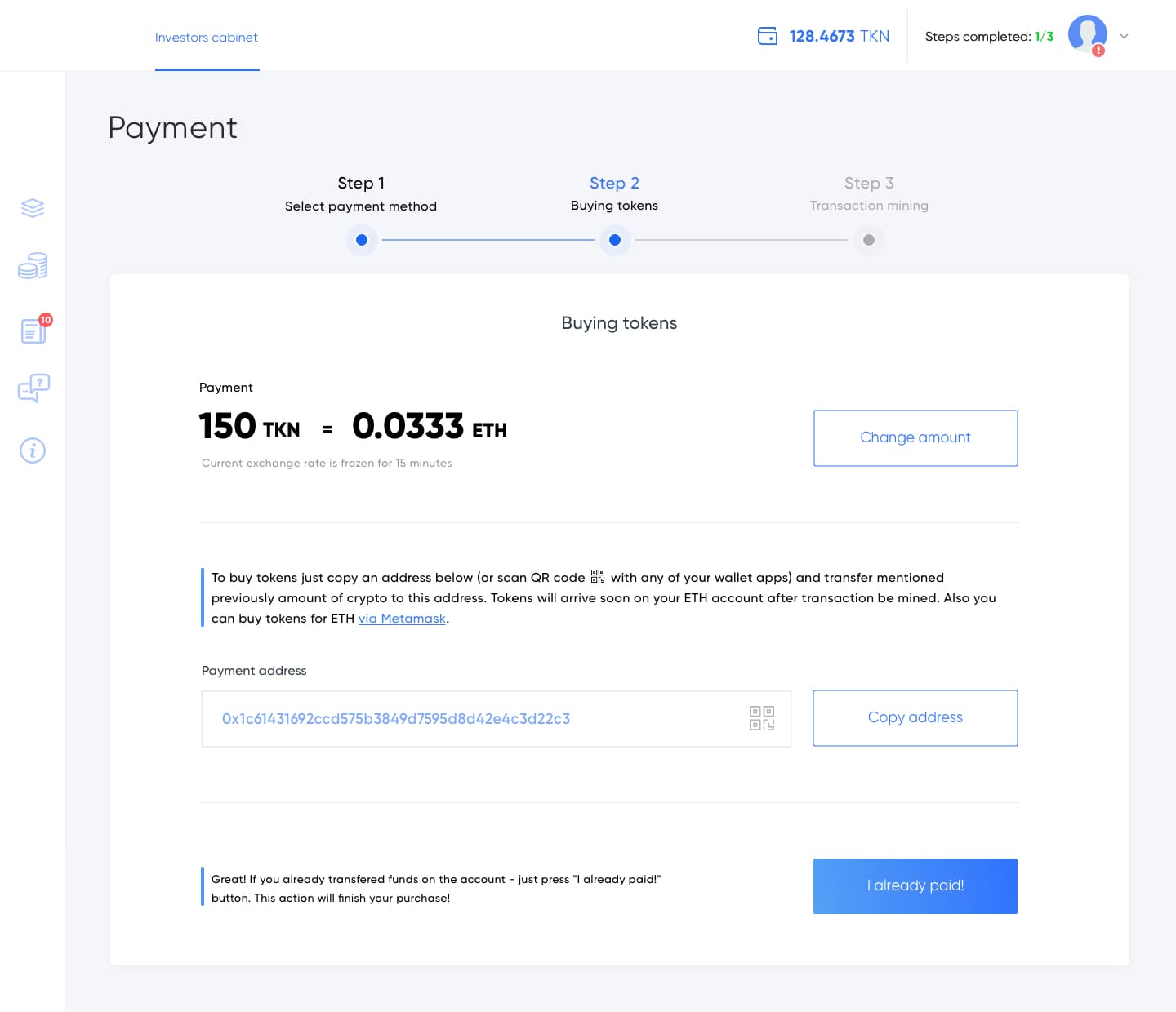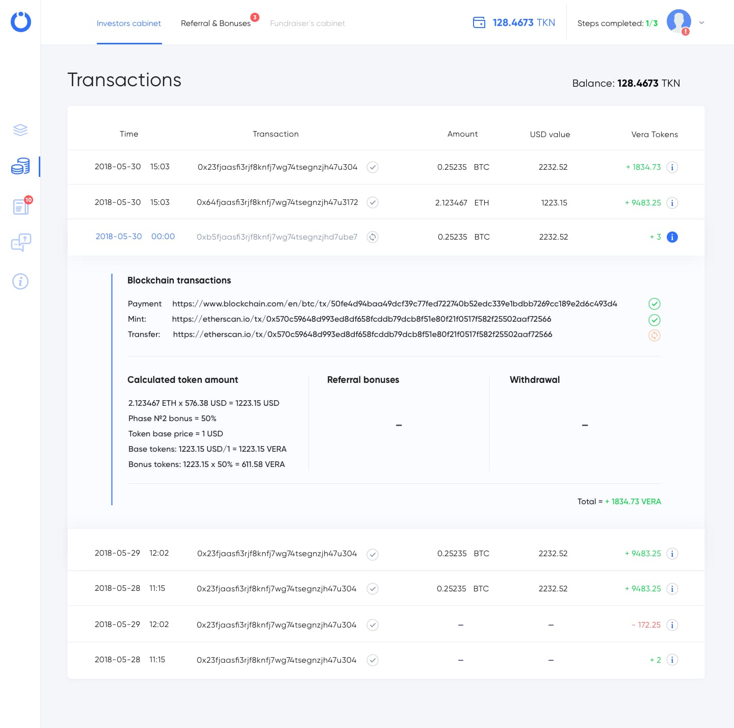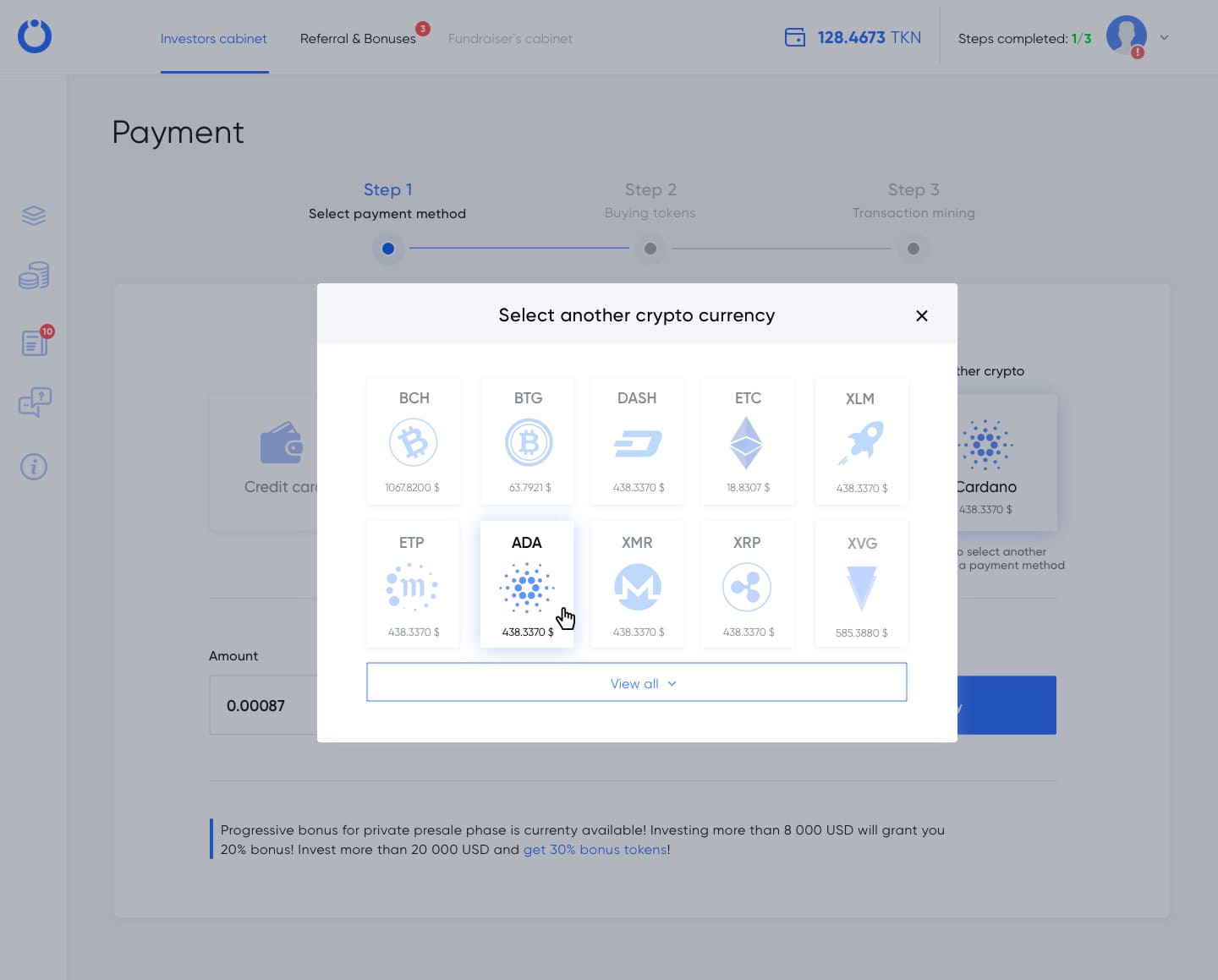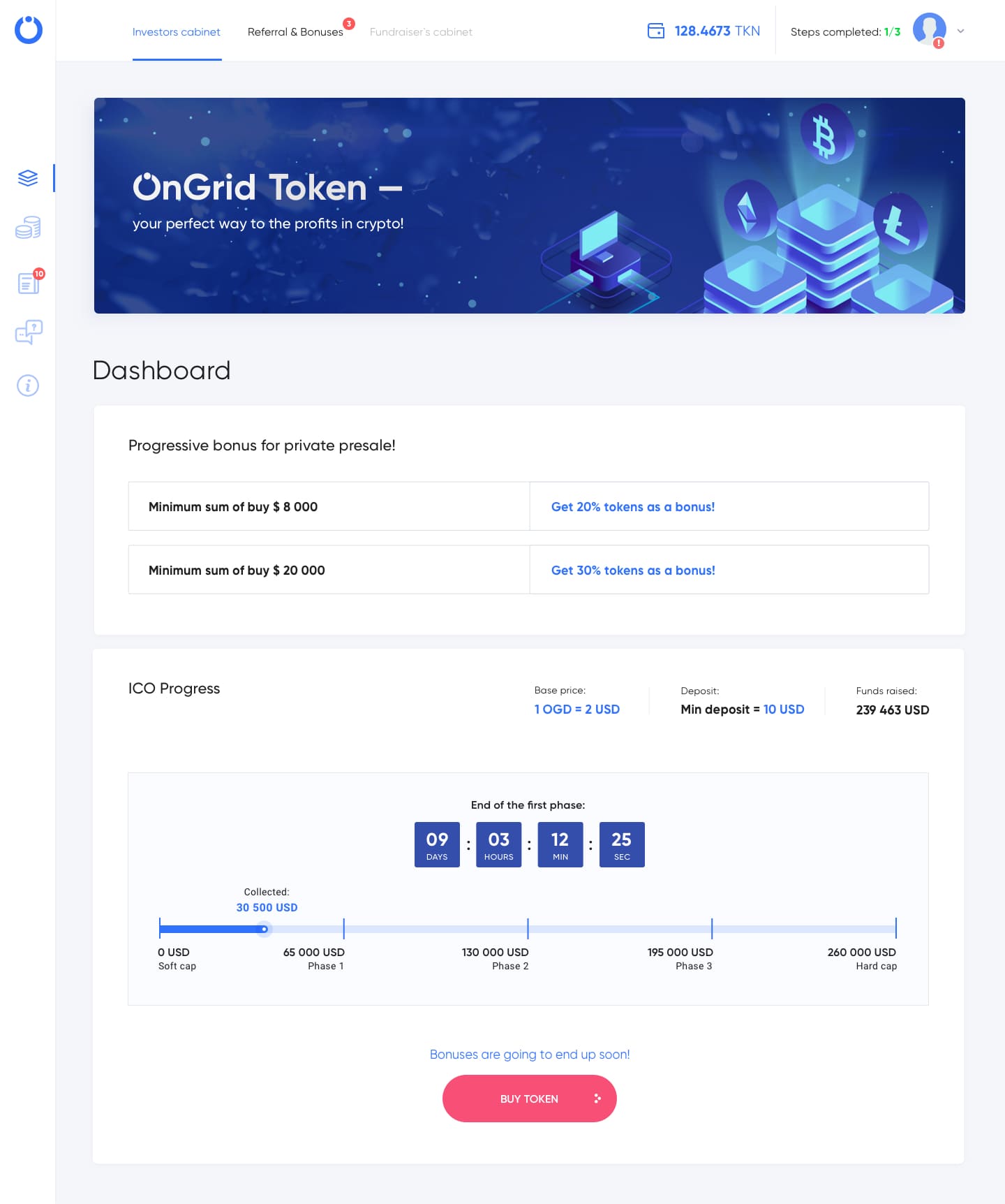 A web based platform for investors that includes token purchasing, payment methods, bonus calculations, and real time ICO progress tracking.