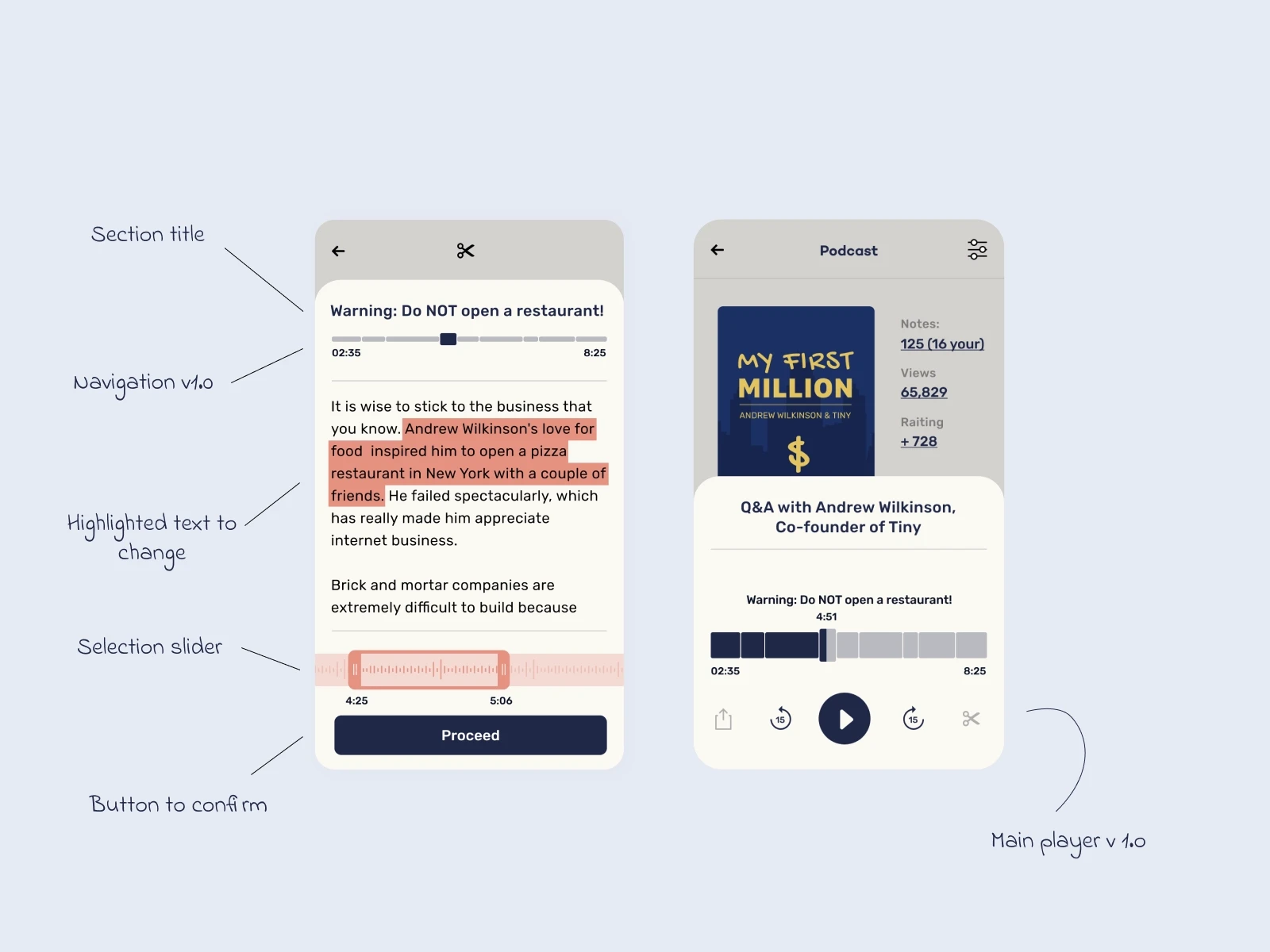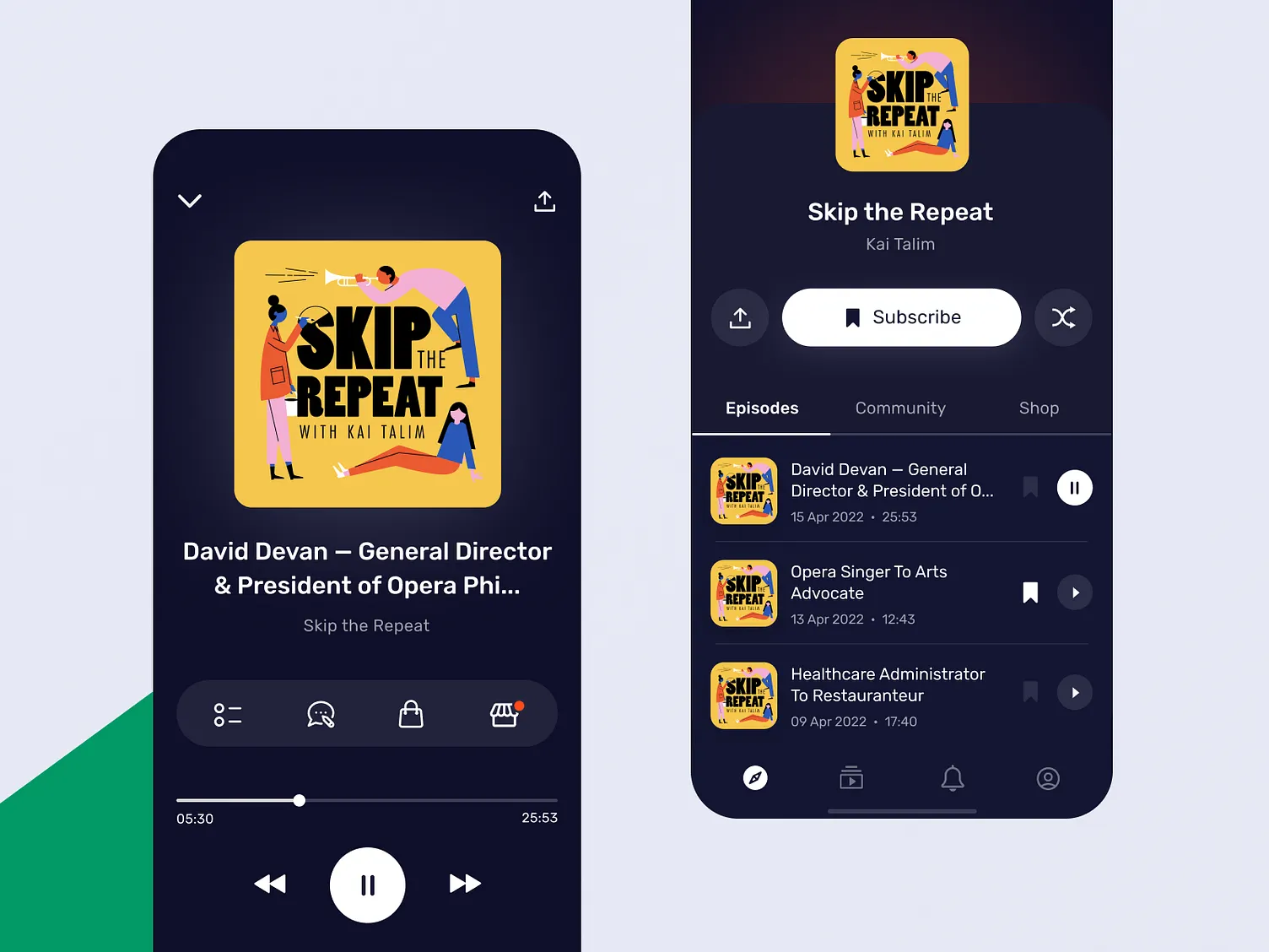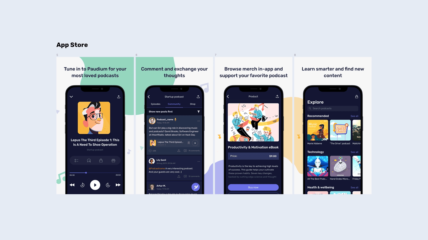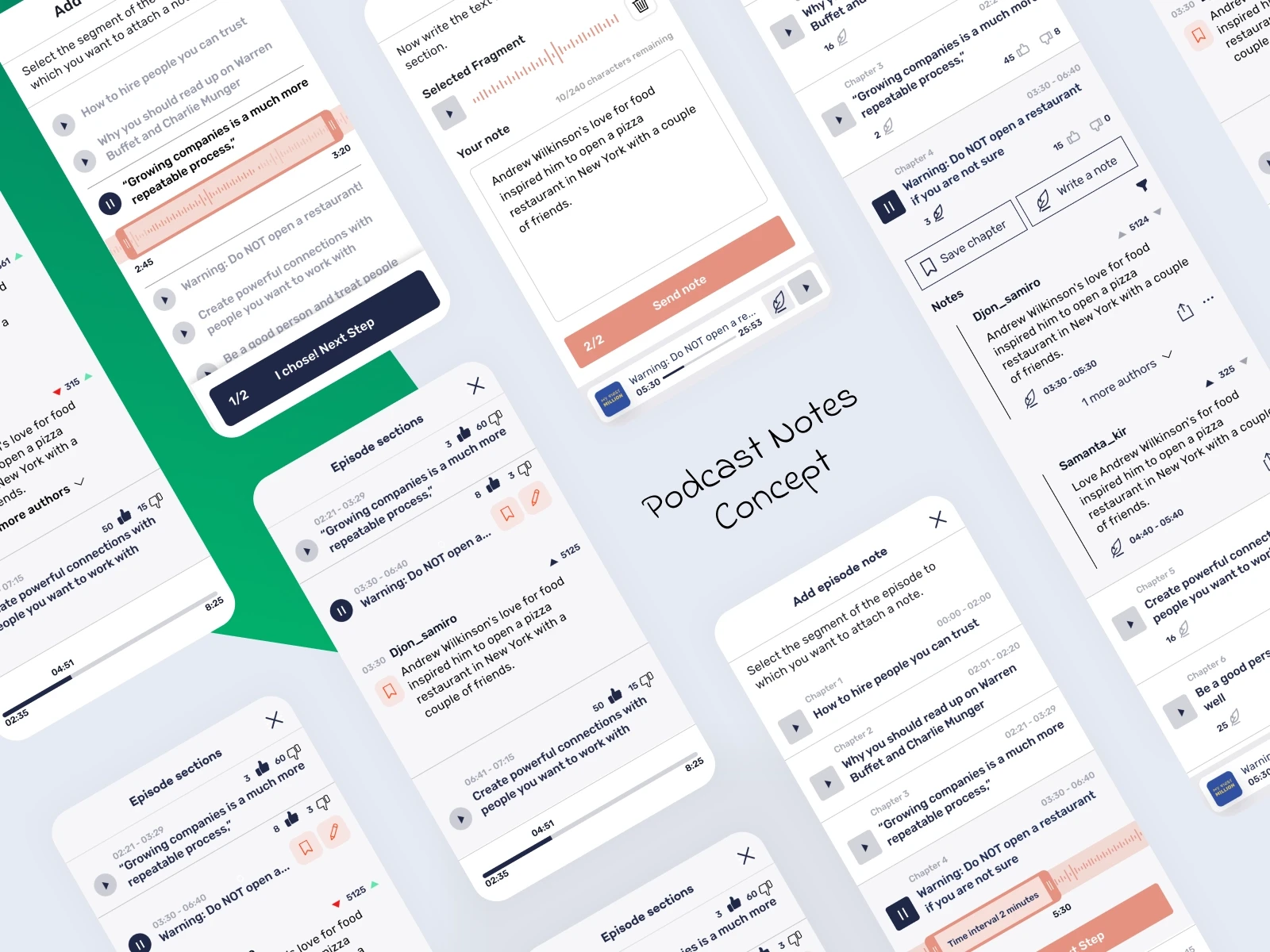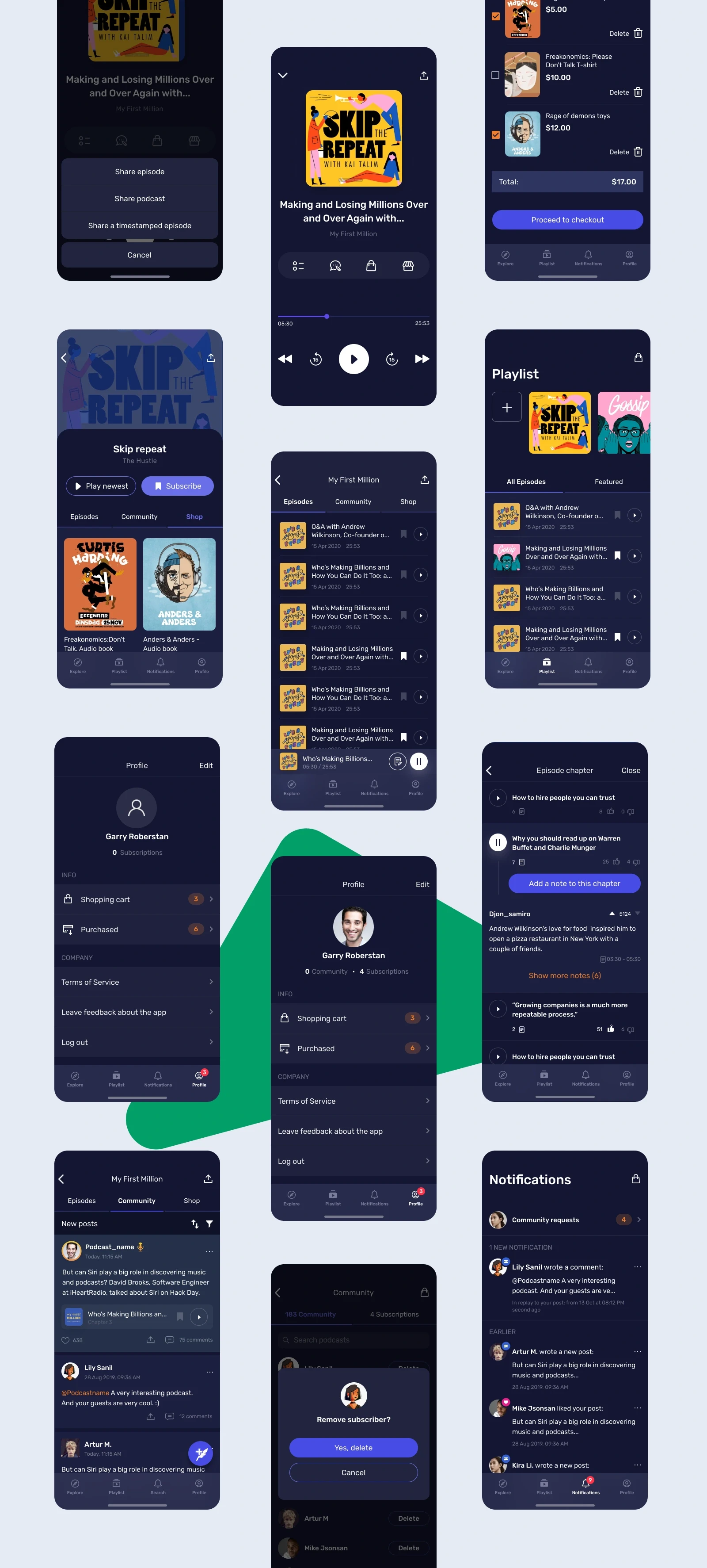 An application that unites podcasts and community in one place. Users can listen to episodes, take notes, build collections, interact with listeners and hosts, and buy products from podcasters.